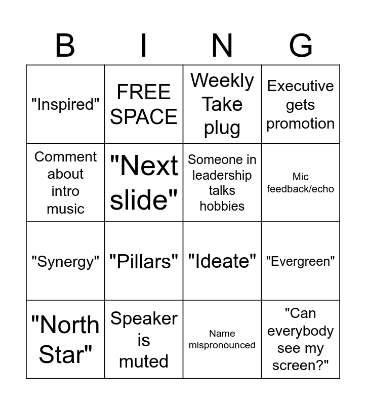 This bingo card has 17 words: Name mispronounced, "North Star", Weekly Take plug, "Inspired", "Pillars", Executive gets promotion, "Evergreen", Someone in leadership talks hobbies, Mic feedback/echo, "Next slide", Speaker is muted, "Ideate", Comment about intro music, FREE SPACE, "Synergy", Pet or child and "Can everybody see my screen?".