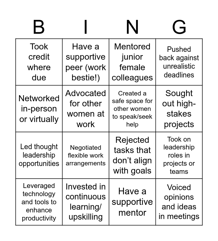This bingo card has 26 words: Free!, Negotiated salary/benefits, Sought out high-stakes projects, Set boundaries for work life balance, Networked in-person or virtually, Took credit where due, Advocated for other women at work, Have a supportive peer (work bestie!), Have a supportive mentor, Have regular PD coaching calls, Led thought leadership opportunities, Rejected tasks that don’t align with goals, Created opportunities for other women at work, Focused on developing a personal brand, Took on leadership roles in projects or teams, Persevered to complete challenging tasks despite setbacks, Pushed back against unrealistic deadlines, Voiced opinions and ideas in meetings, Mentored junior female colleagues, Leveraged technology and tools to enhance productivity, Negotiated flexible work arrangements, Engaged in self-care and wellness practices to maintain mental and physical health, Invested in continuous learning/ upskilling, Identified gaps in women representation, Created a safe space for other women to speak/seek help and Speak out against discrimination.