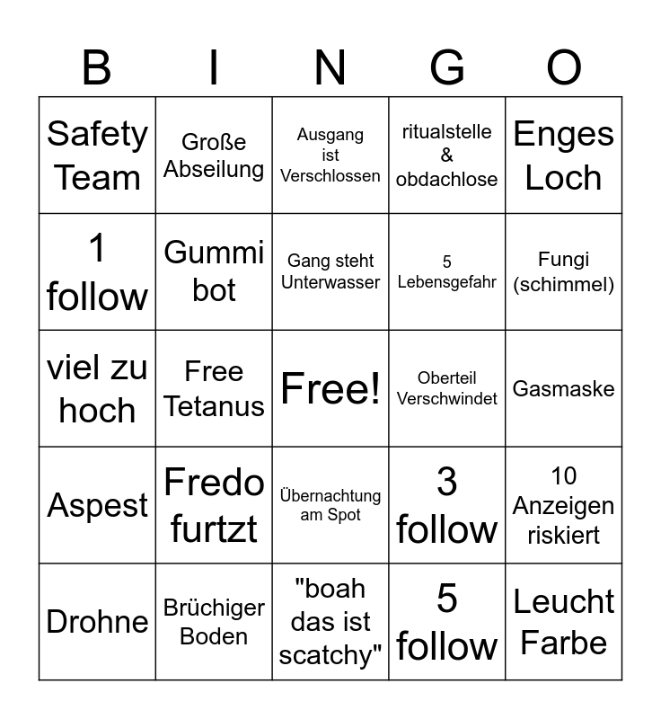 This bingo card has a free space and 24 words: Fredo furtzt, Brüchiger Boden, Gang steht Unterwasser, Drohne, Enges Loch, Safety Team, 1 follow, Große Abseilung, Oberteil Verschwindet, Übernachtung am Spot, 5 Lebensgefahr, viel zu hoch, 3 follow, 10 Anzeigen riskiert, Gummi bot, 5 follow, Gasmaske, Ausgang ist Verschlossen, Fungi (schimmel), Free Tetanus, Leucht Farbe, Aspest, ritualstelle & obdachlose and "boah das ist scatchy".