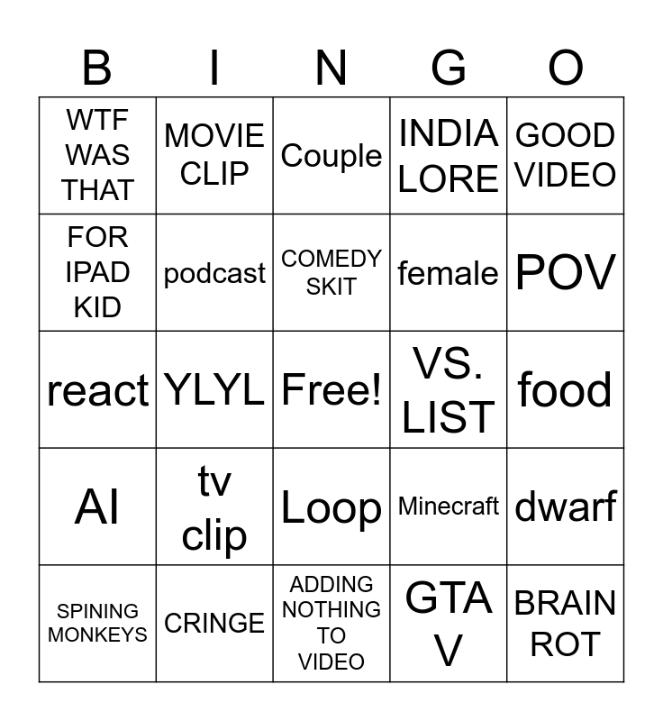 This bingo card has a free space and 24 words: tv clip, CRINGE, COMEDY SKIT, SPINING MONKEYS, GOOD VIDEO, WTF WAS THAT, FOR IPAD KID, MOVIE CLIP, VS. LIST, Loop, female, react, Minecraft, dwarf, podcast, GTA V, food, Couple, POV, YLYL, BRAIN ROT, AI, INDIA LORE and ADDING NOTHING TO VIDEO.