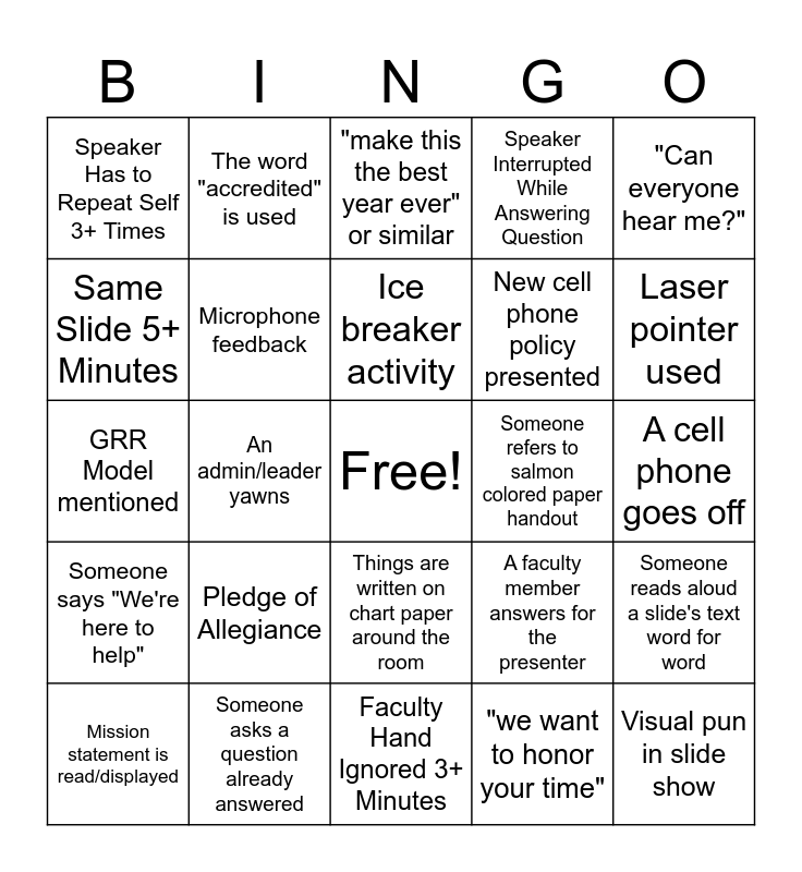 This bingo card has a free space and 32 words: "we want to honor your time", There is a technical difficulty, An admin/leader yawns, Norms are mentioned, Someone says "We're here to help", Microphone feedback, "Can everyone hear me?", Someone reads aloud a slide's text word for word, The word "accredited" is used, Data is shown in bar graph, Ice breaker activity, "make this the best year ever" or similar, A joke falls flat, Last Year's test scores are discussed, Someone refers to salmon colored paper handout, More than one Stanley type cup at one table, Mission statement is read/displayed, GRR Model mentioned, Things are written on chart paper around the room, Pledge of Allegiance, A faculty member answers for the presenter, Inspirational video shown, A cell phone goes off, Someone asks a question already answered, Visual pun in slide show, Speaker Interrupted While Answering Question, New cell phone policy presented, Same Slide 5+ Minutes, Speaker Has to Repeat Self 3+ Times, Faculty Hand Ignored 3+ Minutes, Speaker Apologizes for small font and Laser pointer used.