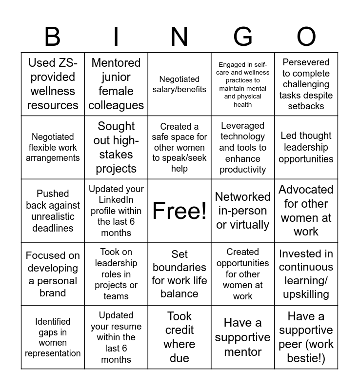 This bingo card has a free space and 30 words: Updated your resume within the last 6 months, Set up a coffee chat with a senior leader, Updated your LinkedIn profile within the last 6 months, Actively pursued a promotion, Used ZS-provided wellness resources, Negotiated salary/benefits, Sought out high-stakes projects, Set boundaries for work life balance, Networked in-person or virtually, Took credit where due, Advocated for other women at work, Have a supportive peer (work bestie!), Have a supportive mentor, Have regular PD coaching calls, Led thought leadership opportunities, Rejected tasks that don’t align with goals, Created opportunities for other women at work, Focused on developing a personal brand, Took on leadership roles in projects or teams, Persevered to complete challenging tasks despite setbacks, Pushed back against unrealistic deadlines, Voiced opinions and ideas in meetings, Mentored junior female colleagues, Leveraged technology and tools to enhance productivity, Negotiated flexible work arrangements, Engaged in self-care and wellness practices to maintain mental and physical health, Invested in continuous learning/ upskilling, Identified gaps in women representation, Created a safe space for other women to speak/seek help and Speak out against discrimination.
