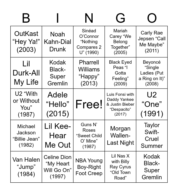 This bingo card has a free space and 52 words: SZA-Kill Bill, Kodak Black-Super Gremlin, Lil Kee-Hear Me Out, NBA Young Boy-Right Foot Creep, Lil Kee-Hear Me Out, Drake-Gods Plan, Noah Kahn-Dial Drunk, NBA Young Boy-Right Foot Creep, Lil Durk-All My Life, Cardi B-I Like It, Kodak Black-Super Gremlin, SZA-Kill Bill, Taylor Swift-Cruel Summer, Morgan Wallen-Last Night, Mark Ronson with Bruno Mars “Uptown Funk!” (2014), Adele “Rolling in the Deep” (2010), Pharrell Williams “Happy” (2013), Luis Fonsi with Daddy Yankee & Justin Bieber “Despacito” (2017), Robin Thicke with T.I. & Pharrell Williams “Blurred Lines” (2013), Carly Rae Jepsen “Call Me Maybe” (2011), Adele “Hello” (2015), Lil Nas X with Billy Ray Cyrus “Old Town Road”, OutKast “Hey Ya!” (2003), Black Eyed Peas “I Gotta Feeling” (2009), Eminem “Lose Yourself” (2002), Usher with Lil’ Jon & Ludacris “Yeah!” (2004), Beyoncé with Jay-Z “Crazy in Love” (2003), Gnarls Barkley “Crazy” (2006), Beyoncé “Single Ladies (Put a Ring on It)” (2008), Rihanna with Jay-Z “Umbrella” (2007), Flo Rida with T-Pain “Low” (2007), Mariah Carey “We Belong Together” (2005), Whitney Houston “I Will Always Love You” (1992), Nirvana “Smells Like Teen Spirit” (1991), Bryan Adams “(Everything I Do) I Do It for You” (1991), Sinéad O’Connor “Nothing Compares 2 U” (1990), Celine Dion “My Heart Will Go On” (1997), Elton John “Candle in the Wind 1997 (Goodbye England’s Rose)” (1997), R.E.M. “Losing My Religion” (1991), Oasis “Wonderwall” (1995), Los Del Rio “Macarena (Bayside Boys Mix)” (1995), U2 “One” (1991), Michael Jackson “Billie Jean” (1982), The Police “Every Breath You Take” (1983), Guns N’ Roses “Sweet Child O’ Mine” (1987), Prince “When Doves Cry” (1984), Joan Jett & the Blackhearts “I Love Rock and Roll” (1981), U2 “With or Without You” (1987), Bon Jovi “Livin’ on a Prayer” (1986), Lionel Richie & Diana Ross “Endless Love” (1981), Van Halen “Jump” (1984) and Michael Jackson “Beat It” (1983).