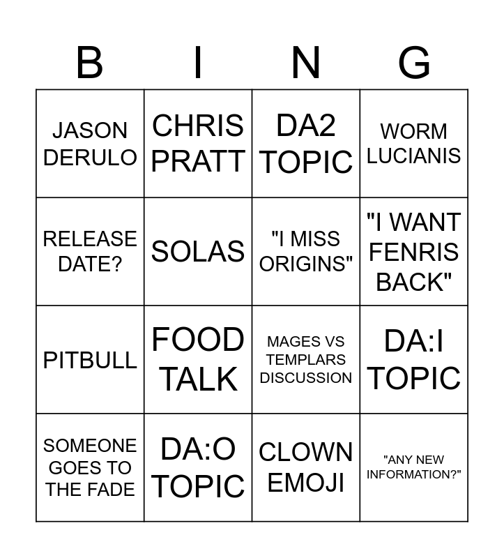 This bingo card has 16 words: DA:O TOPIC, DA:I TOPIC, DA2 TOPIC, JASON DERULO, PITBULL, CHRIS PRATT, MAGES VS TEMPLARS DISCUSSION, CLOWN EMOJI, RELEASE DATE?, SOLAS, SOMEONE GOES TO THE FADE, WORM LUCIANIS, FOOD TALK, "I WANT FENRIS BACK", "I MISS ORIGINS" and "ANY NEW INFORMATION?".