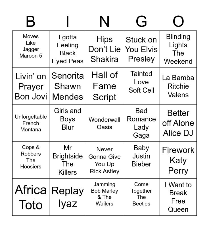 This bingo card has a free space and 24 words: Mr Brightside The Killers, Replay Iyaz, Hall of Fame Script, Africa Toto, Blinding Lights The Weekend, Moves Like Jagger Maroon 5, Livin’ on Prayer Bon Jovi, I gotta Feeling Black Eyed Peas, Bad Romance Lady Gaga, Never Gonna Give You Up Rick Astley, Tainted Love Soft Cell, Unforgettable French Montana, Baby Justin Bieber, Firework Katy Perry, Senorita Shawn Mendes, Come Together The Beetles, Better off Alone Alice DJ, Hips Don’t Lie Shakira, La Bamba Ritchie Valens, Girls and Boys Blur, I Want to Break Free Queen, Cops & Robbers The Hoosiers, Stuck on You Elvis Presley and Jamming Bob Marley & The Wailers.