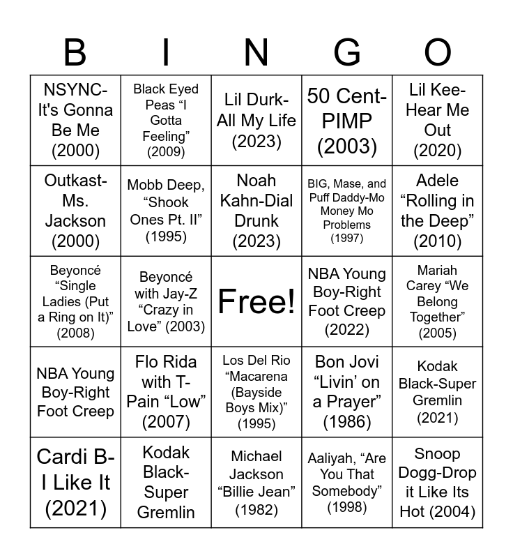 This bingo card has a free space and 59 words: SZA-Kill Bill, Kodak Black-Super Gremlin, Lil Kee-Hear Me Out, NBA Young Boy-Right Foot Creep, Aaliyah, “Are You That Somebody” (1998), Oasis, “Wonderwall” (1995), Mobb Deep, “Shook Ones Pt. II” (1995), Dr. Dre and Snoop Dogg, “Nuthin’ but a ‘G’ Thang” (1992), BIG, Mase, and Puff Daddy-Mo Money Mo Problems (1997), Blackstreet-No Diggty (1996), 50 Cent-PIMP (2003), Jay Z-99 Problems (2003), Outkast-Ms. Jackson (2000), Damien Marley-Welcome to Jamrock (2005), Kanye West-Gold Digger (2005), NSYNC-It's Gonna Be Me (2000), Snoop Dogg-Drop it Like Its Hot (2004), Lil Kee-Hear Me Out (2020), Drake-Gods Plan (2018), Noah Kahn-Dial Drunk (2023), NBA Young Boy-Right Foot Creep (2022), Lil Durk-All My Life (2023), Cardi B-I Like It (2021), Kodak Black-Super Gremlin (2021), SZA-Kill Bill (2022), Taylor Swift-Cruel Summer (2023), Morgan Wallen-Last Night (2023), Mark Ronson with Bruno Mars “Uptown Funk!” (2014), Adele “Rolling in the Deep” (2010), Luis Fonsi with Daddy Yankee & Justin Bieber “Despacito” (2017), Carly Rae Jepsen “Call Me Maybe” (2011), Adele “Hello” (2015), Lil Nas X with Billy Ray Cyrus “Old Town Road”, OutKast “Hey Ya!” (2003), Black Eyed Peas “I Gotta Feeling” (2009), Eminem “Lose Yourself” (2002), Usher with Lil’ Jon & Ludacris “Yeah!” (2004), Beyoncé with Jay-Z “Crazy in Love” (2003), Gnarls Barkley “Crazy” (2006), Beyoncé “Single Ladies (Put a Ring on It)” (2008), Rihanna with Jay-Z “Umbrella” (2007), Flo Rida with T-Pain “Low” (2007), Mariah Carey “We Belong Together” (2005), Whitney Houston “I Will Always Love You” (1992), Nirvana “Smells Like Teen Spirit” (1991), Celine Dion “My Heart Will Go On” (1997), Elton John “Candle in the Wind 1997 (Goodbye England’s Rose)” (1997), Oasis “Wonderwall” (1995), Los Del Rio “Macarena (Bayside Boys Mix)” (1995), Michael Jackson “Billie Jean” (1982), The Police “Every Breath You Take” (1983), Guns N’ Roses “Sweet Child O’ Mine” (1987), Prince “When Doves Cry” (1984), Joan Jett & the Blackhearts “I Love Rock and Roll” (1981), U2 “With or Without You” (1987), Bon Jovi “Livin’ on a Prayer” (1986), Lionel Richie & Diana Ross “Endless Love” (1981), Van Halen “Jump” (1984) and Michael Jackson “Beat It” (1983).