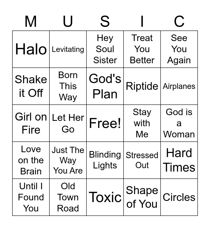 This bingo card has a free space and 44 words: As it Was, Just The Way You Are, Take Me to Church, Shape of You, One Kiss, Umbrella, Born This Way, Rolling in The Deep, Treat You Better, Circles, Halo, Old Town Road, Stressed Out, God is a Woman, Love Yourself, Diamonds, Toxic, Stay with Me, Blank Space, Girl on Fire, Levitating, Blinding Lights, Chandelier, See You Again, Perfect, Driver's License, God's Plan, Talking to the Moon, Hard Times, Until I Found You, Cheap Thrills, Hey Soul Sister, Paradise, Party in the USA, Love on the Brain, Young and Beautiful, Firework, Hotline Bling, Airplanes, Shake it Off, Let Her Go, Count on Me, Riptide and Electric Feel.