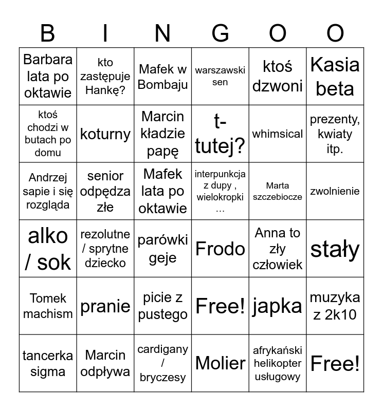 This bingo card has 36 words: Free!, picie z pustego, Molier, ktoś chodzi w butach po domu, alko / sok, interpunkcja z dupy , wielokropki …, koturny, cardigany / bryczesy, ktoś dzwoni, japka, prezenty, kwiaty itp., warszawski sen, muzyka z 2k10, senior odpędza złe, t-tutej?, Barbara lata po oktawie, Tomek machism, Marta szczebiocze, Andrzej sapie i się rozgląda, Mafek w Bombaju, Mafek lata po oktawie, rezolutne / sprytne dziecko, Frodo, parówki geje, Anna to zły człowiek, kto zastępuje Hankę?, whimsical, Marcin odpływa, Marcin kładzie papę, Kasia beta, Free!, tancerka sigma, stały, zwolnienie, pranie and afrykański helikopter usługowy.
