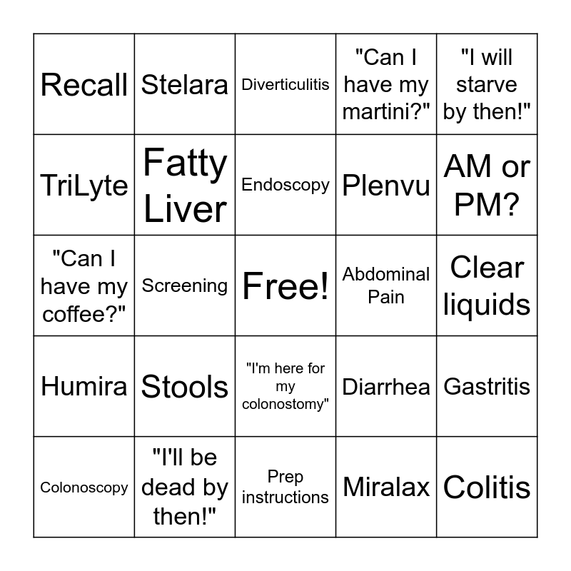 This bingo card has a free space and 29 words: Colonoscopy, GoLytely, Screening, Suflave, Recall, Diverticulitis, Fatty Liver, Stools, Abdominal Pain, "I'll be dead by then!", Clear liquids, Colitis, Prep instructions, Miralax, AM or PM?, "Am I in the right place?", "I'm here for my colonostomy", Humira, "I will starve by then!", "Can I have my coffee?", Diarrhea, Clenpiq, Plenvu, TriLyte, "Can I have my martini?", Stelara, Gastritis, Endoscopy and Pancreatitis.