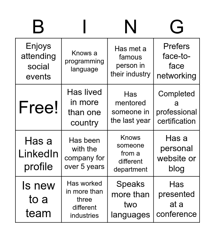 This bingo card has 16 words: Has worked in more than three different industries, Has a personal website or blog, Has met a famous person in their industry, Enjoys attending social events, Has a LinkedIn profile, Knows a programming language, Knows someone from a different department, Speaks more than two languages, Free!, Has lived in more than one country, Is new to a team, Prefers face-to-face networking, Has been with the company for over 5 years, Completed a professional certification, Has mentored someone in the last year and Has presented at a conference.