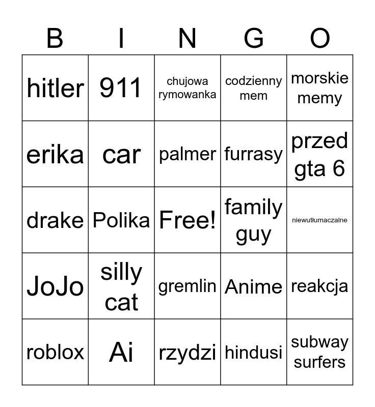 This bingo card has a free space and 24 words: silly cat, Ai, palmer, roblox, morskie memy, hitler, erika, 911, family guy, gremlin, furrasy, drake, Anime, reakcja, car, hindusi, niewutłumaczalne, chujowa rymowanka, przed gta 6, Polika, subway surfers, JoJo, codzienny mem and rzydzi.
