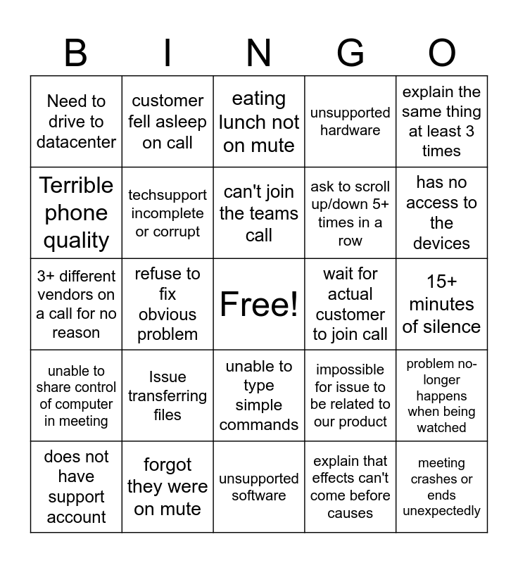 This bingo card has a free space and 24 words: Issue transferring files, forgot they were on mute, can't join the teams call, does not have support account, explain the same thing at least 3 times, Need to drive to datacenter, Terrible phone quality, customer fell asleep on call, wait for actual customer to join call, unable to type simple commands, ask to scroll up/down 5+ times in a row, 3+ different vendors on a call for no reason, impossible for issue to be related to our product, problem no-longer happens when being watched, techsupport incomplete or corrupt, explain that effects can't come before causes, 15+ minutes of silence, eating lunch not on mute, has no access to the devices, refuse to fix obvious problem, meeting crashes or ends unexpectedly, unable to share control of computer in meeting, unsupported hardware and unsupported software.