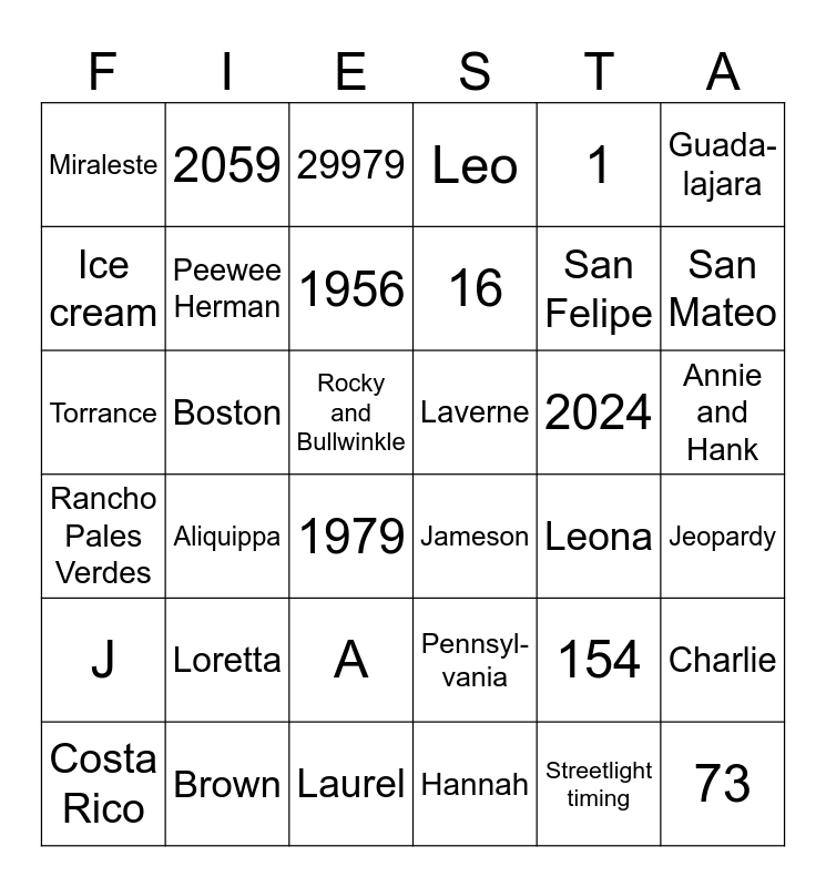This bingo card has 36 words: Pennsyl-vania, A, Hannah, Ice cream, Rancho Pales Verdes, Laverne, Peewee Herman, Laurel, 1, 154, San Mateo, Leo, Charlie, Boston, 16, Miraleste, J, 2024, Torrance, 29979, Rocky and Bullwinkle, Aliquippa, Jameson, 1979, Leona, 2059, San Felipe, Brown, 1956, Guada-lajara, 73, Costa Rico, Jeopardy, Annie and Hank, Loretta and Streetlight timing.