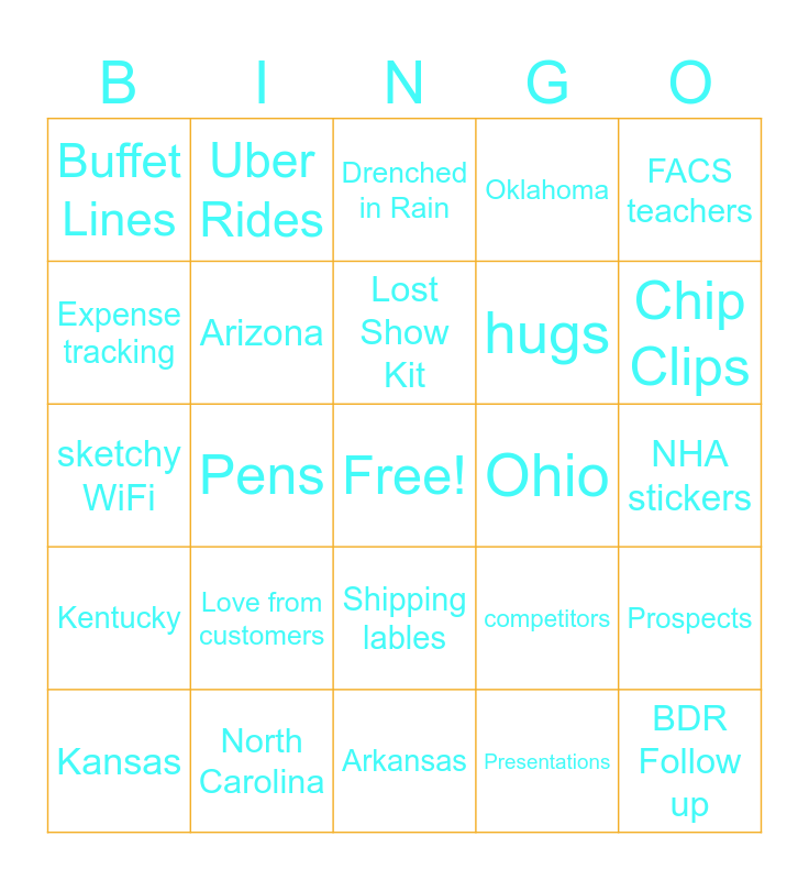 This bingo card has a free space and 42 words: Delayed Flight, Lost Show Kit, TSA lines, Love from customers, Presentations, Prospects, BDR Follow up, new pricing, Drenched in Rain, Shipping lables, NHA stickers, Chip Clips, Pens, FACS teachers, Folded table cloths, competitors, Humidity, sketchy WiFi, Hotel breakfast bar, Uber Rides, Expense tracking, booth photo, FedEx office, Buffet Lines, Keynote speakers, networking, hugs, HOSA, Texas, Alabama, Tennessee, Kentucky, Arizona, Arkansas, Missouri, Kansas, North Carolina, Ohio, Florida, Colorado, Oklahoma and Vacation.