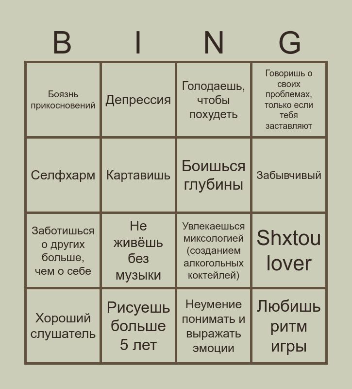 This bingo card has 16 words: Рисуешь больше 5 лет, Shxtou lover, Голодаешь, чтобы похудеть, Боязнь прикосновений, Заботишься о других больше, чем о себе, Депрессия, Увлекаешься миксологией (созданием алкогольных коктейлей), Неумение понимать и выражать эмоции, Селфхарм, Картавишь, Хороший слушатель, Говоришь о своих проблемах, только если тебя заставляют, Не живёшь без музыки, Забывчивый, Боишься глубины and Любишь ритм игры.