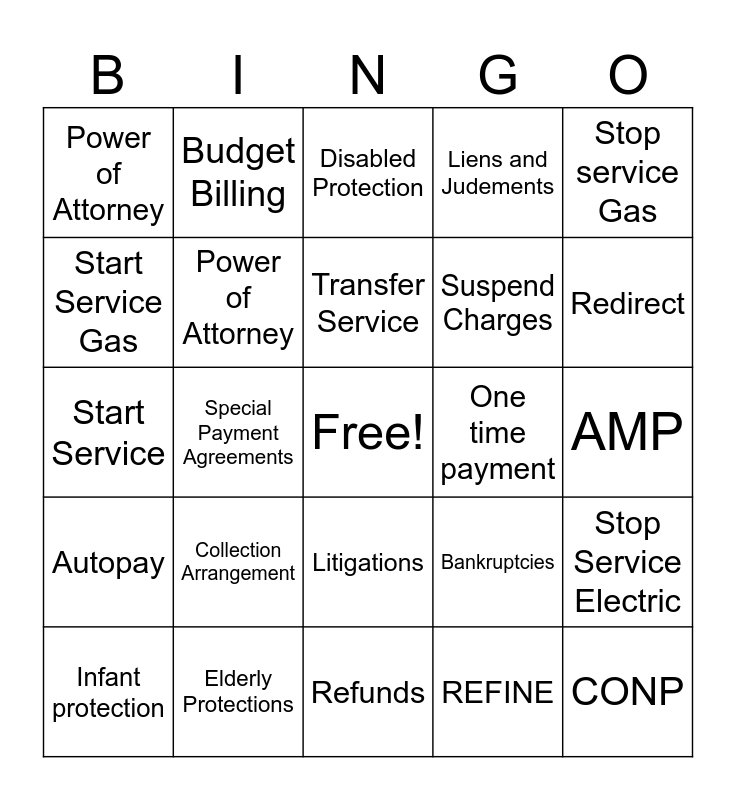 This bingo card has a free space and 24 words: Infant protection, Collection Arrangement, Transfer Service, REFINE, Stop service Gas, Power of Attorney, Budget Billing, Disabled Protection, One time payment, AMP, Start Service, Power of Attorney, Bankruptcies, Stop Service Electric, Start Service Gas, Elderly Protections, Refunds, Liens and Judements, Redirect, Autopay, Special Payment Agreements, Litigations, Suspend Charges and CONP.