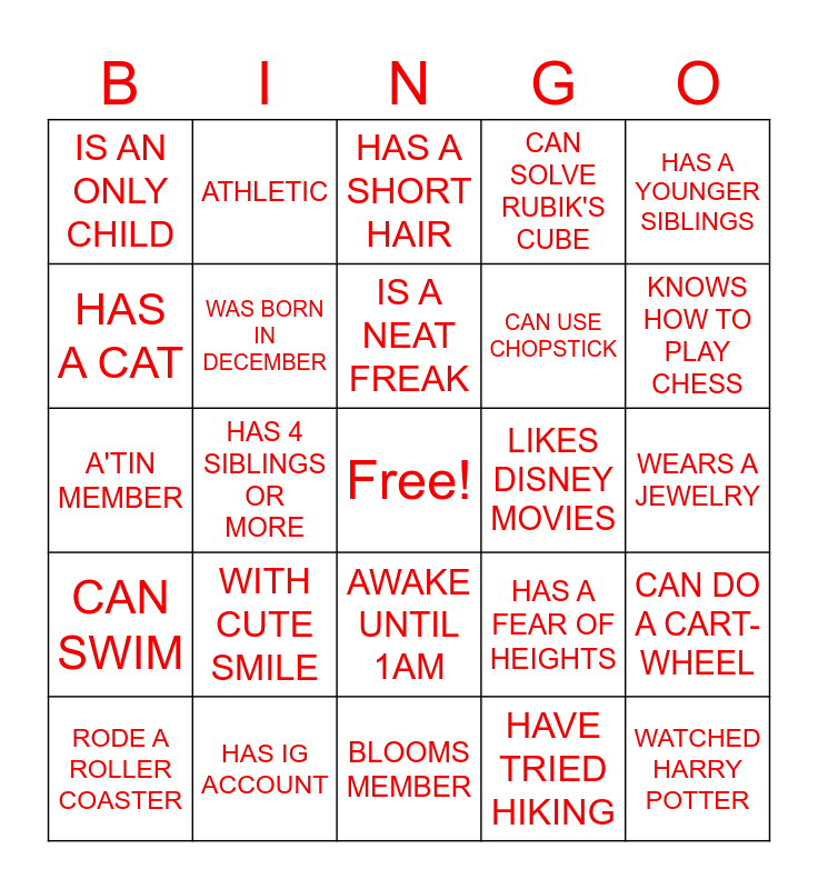 This bingo card has a free space and 24 words: WITH CUTE SMILE, HAS IG ACCOUNT, IS A NEAT FREAK, RODE A ROLLER COASTER, HAS A YOUNGER SIBLINGS, IS AN ONLY CHILD, HAS A CAT, ATHLETIC, LIKES DISNEY MOVIES, AWAKE UNTIL 1AM, CAN USE CHOPSTICK, A'TIN MEMBER, HAS A FEAR OF HEIGHTS, CAN DO A CART-WHEEL, WAS BORN IN DECEMBER, HAVE TRIED HIKING, WEARS A JEWELRY, HAS A SHORT HAIR, KNOWS HOW TO PLAY CHESS, HAS 4 SIBLINGS OR MORE, WATCHED HARRY POTTER, CAN SWIM, CAN SOLVE RUBIK'S CUBE and BLOOMS MEMBER.