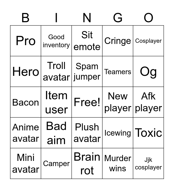 This bingo card has a free space and 24 words: Bad aim, Camper, Spam jumper, Mini avatar, Cosplayer, Pro, Hero, Good inventory, New player, Plush avatar, Teamers, Bacon, Icewing, Toxic, Troll avatar, Murder wins, Afk player, Sit emote, Og, Item user, Jjk cosplayer, Anime avatar, Cringe and Brain rot.