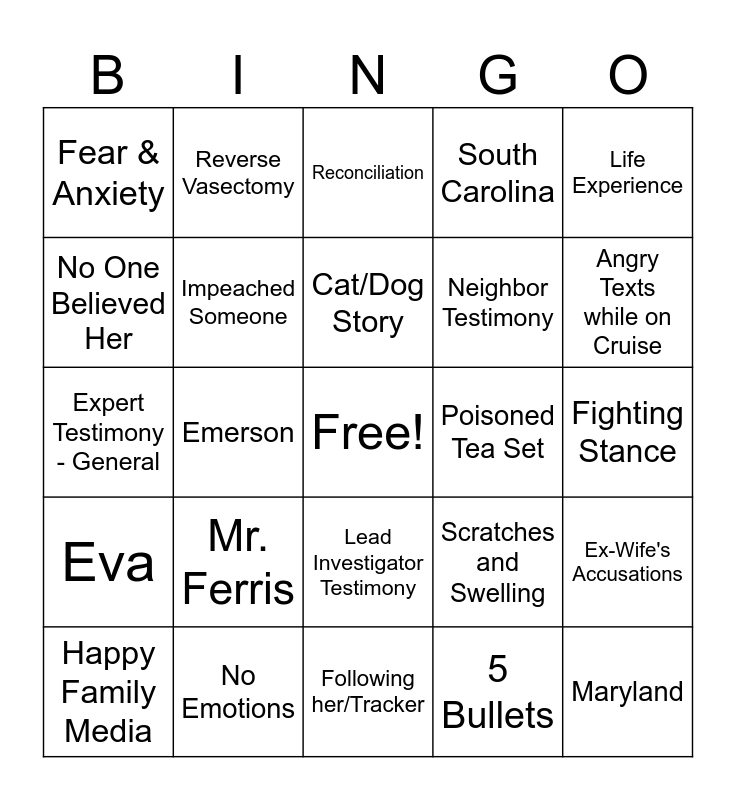 This bingo card has a free space and 40 words: Jury Instructions, Expert Testimony - General, If/Then, Impeached Someone, No Emotions, Lead Investigator Testimony, Cat/Dog Story, No Contact Order, Life Experience, Eva, Emerson, South Carolina, Maryland, Fighting Stance, Poisoned Tea Set, Mr. Ferris, Duluth Wheel, Fear & Anxiety, Happy Texts, Reconciliation, Ex-Wife's Accusations, 5 Bullets, Neighbor Testimony, No One Believed Her, Both Sides Mention Leg Wound, Loose Firearms, Lured Him over, Blocked her from Leaving, Wouldn't Leave When Asked, Hole in the Wall, Bullet Hole in Ceiling, Happy Family Media, No Physical Signs, Scratches and Swelling, Angry Texts while on Cruise, Following her/Tracker, His size mentioned by both, Her ballerina company, Reverse Vasectomy and Her performance experience.