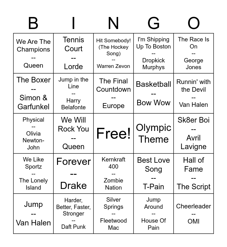 This bingo card has a free space and 64 words: The Hockey Song -- Stompin' Tom Connors, Surfin' U.S.A. -- The Beach Boys, Centerfield -- John Fogerty, Hall of Fame -- The Script, Space Jam -- Quad City DJ's, The Boys of Fall -- Kenny Chesney, Tennis Court -- Lorde, Eye of the Tiger -- Survivor, The Final Countdown -- Europe, Sandstorm -- Darude, Kernkraft 400 -- Zombie Nation, Bicycle Race -- Queen, Sk8er Boi -- Avril Lavigne, The Race Is On -- George Jones, All I Do Is Win -- Dj Khaled, The Boxer -- Simon & Garfunkel, We Will Rock You -- Queen, We Are The Champions -- Queen, Seven Nation Army -- The White Stripes, Basketball -- Bow Wow, Forever -- Drake, We Like Sportz -- The Lonely Island, I'm Shipping Up To Boston -- Dropkick Murphys, Mrs. Robinson -- Simon & Garfunkel, The Boys Of Summer -- Don Henley, Go Cubs Go -- Steve Goodman, Glory Days -- Bruce Springsteen, Na Na Hey Hey Kiss Him Goodbye -- Steam, Poker Face -- Lady Gaga, The Gambler -- Kenny Rogers, Kobe Bryant -- Lil Wayne, Marathon -- Rush, Born to Run -- Bruce Springsteen, Running Up That Hill -- Kate Bush, Runnin' with the Devil -- Van Halen, Jump -- Van Halen, Jump -- Kris Kross, Jump Around -- House Of Pain, Jumper -- Third Eye Blind, Jump in the Line -- Harry Belafonte, Physical -- Olivia Newton-John, Olympic Theme, Chariots Of Fire, One Shining Moment -- Luther Vandross, Kung Fu Fighting -- Carl Douglas, Cheerleader -- OMI, Harder, Better, Faster, Stronger -- Daft Punk, Stadium Rave -- Spongebob Squarepants, Best Love Song -- T-Pain, Sweet Victory -- Spongebob Squarepants, Gold on the Ceiling -- The Black Keys, Gold Digger -- Kanye West, Silver Springs -- Fleetwood Mac, Sister Golden Hair -- America, Believe It or Not -- Joey Scarbury, One Moment in Time -- Whitney Houston, Hit Somebody! (The Hockey Song) -- Warren Zevon, Do The John Wall -- Troop 41, All Star -- Smash Mouth, Wild Thing -- X, You're The Best -- Joe "Bean" Esposito, Roundball Rock -- John Tesh, Paris -- The Chainsmokers and Paris -- Taylor Swift.