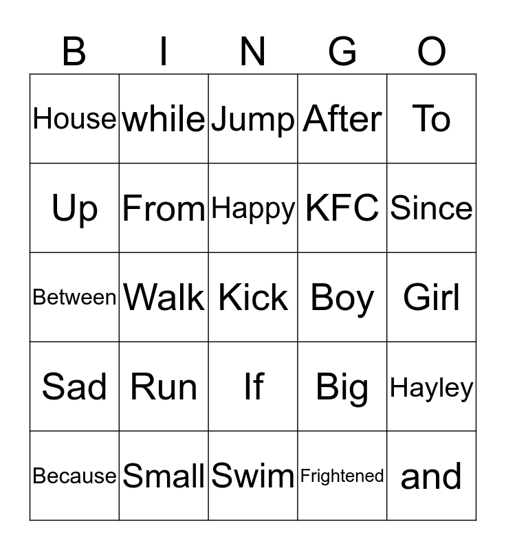 This bingo card has a free space and 24 words: Run, Small, Happy, Because, To, House, Up, while, Boy, If, KFC, Between, Big, Hayley, From, Frightened, Girl, Jump, Since, Walk, and, Sad, After and Swim.