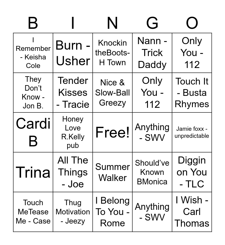 This bingo card has a free space and 51 words: Kissing You - Total, I Wish - Carl Thomas, AlThink Of You - Troop, I Belong To You - Rome, All The Things - Joe, Stand The Rain-Neweditio, Burn - Usher, Shawty - Plies, They Don’t Know - Jon B., One Wish - Ray J, Tender Kisses - Tracie, Nann - Trick Daddy, Diggin on You - TLC, Should’ve Known BMonica, What You Want-Dru, How Time Flies - Janet, Nice & Slow-Ball Greezy, Anything - SWV, I Remember - Keisha Cole, Only You - 112, Honey Love R.Kelly pub, Anything - SWV, I Remember - Keisha Cole, Only You - 112, Party Up - DMX, Candy Rain-SoulForReal, Touch It - Busta Rhymes, Stir Fry - Migos, Touch MeTease Me - Case, Knockin theBoots- H Town, Afterthe Pain-BettyWrig, PartyAin’t Party- Queen, Happy People - R. Kelly, Bug A Boo-Destiny Child, Goodies - Ciara, Thug Motivation - Jeezy, In My Feelings - Drake, Bring Em Out - T.I., Just in case - Jaheim, Jamie foxx- slow jamz, Jamie foxx - unpredictable, Trina, Trick daddy, Sexy Red, Bossman D low, Latto, Cardi B, City girls, Jeezy, Summer Walker and SZA.
