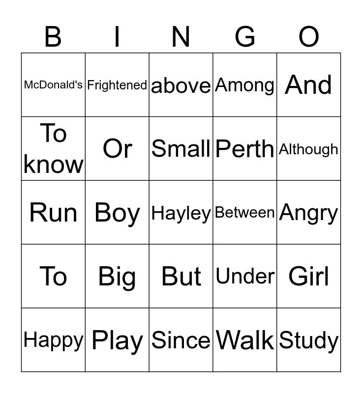 This bingo card has a free space and 24 words: Big, Play, Small, Happy, And, McDonald's, To know, Frightened, Between, But, Perth, Run, Under, Girl, Or, Walk, Angry, above, Although, Boy, Study, To, Among and Since.