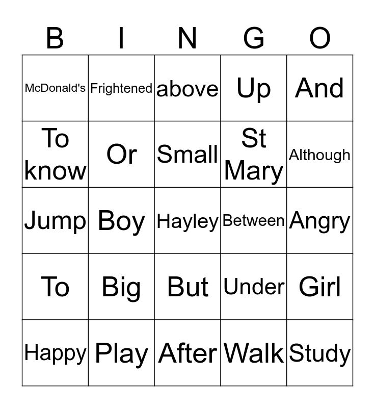 This bingo card has a free space and 24 words: Big, Play, Small, Happy, And, McDonald's, To know, Frightened, Between, But, St Mary, Jump, Under, Girl, Or, Walk, Angry, above, Although, Boy, Study, To, Up and After.