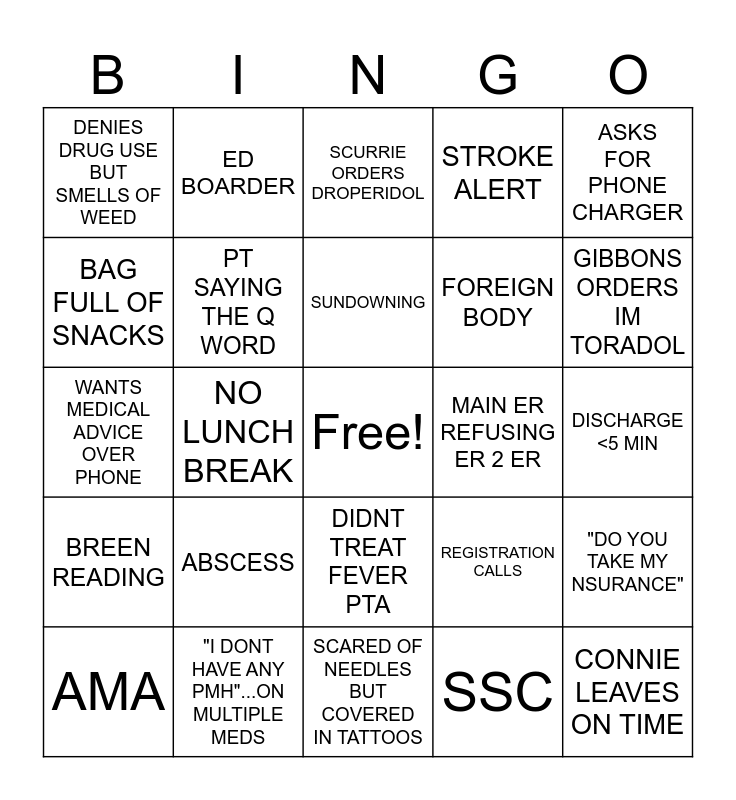 This bingo card has a free space and 24 words: ABSCESS, "I DONT HAVE ANY PMH"...ON MULTIPLE MEDS, SUNDOWNING, AMA, ASKS FOR PHONE CHARGER, DENIES DRUG USE BUT SMELLS OF WEED, BAG FULL OF SNACKS, ED BOARDER, MAIN ER REFUSING ER 2 ER, DIDNT TREAT FEVER PTA, FOREIGN BODY, WANTS MEDICAL ADVICE OVER PHONE, REGISTRATION CALLS, "DO YOU TAKE MY NSURANCE", PT SAYING THE Q WORD, SSC, DISCHARGE <5 MIN, SCURRIE ORDERS DROPERIDOL, GIBBONS ORDERS IM TORADOL, NO LUNCH BREAK, CONNIE LEAVES ON TIME, BREEN READING, STROKE ALERT and SCARED OF NEEDLES BUT COVERED IN TATTOOS.