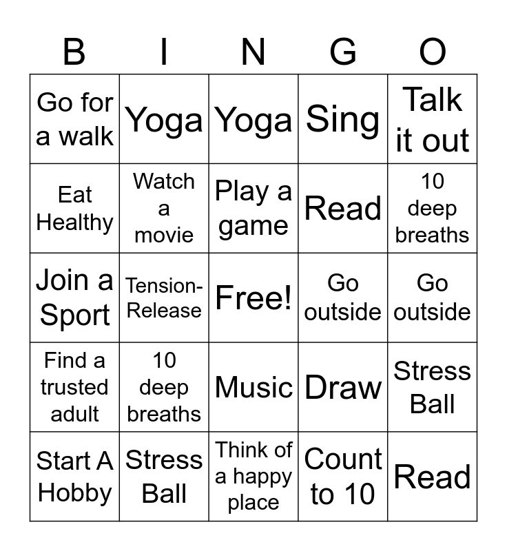 This bingo card has a free space and 50 words: Go for a walk, Read, Walk Away, Think of a happy place, 10 deep breaths, Exercise, Yoga, Music, Eat Healthy, Friends, Watch a movie, Sing, Stress Ball, Draw, Journal, Ask for help, Play a game, Go outside, Pop bubble wrap, Talk it out, Tension-Release, Count to 10, Go for a walk, Read, Walk Away, Think of a happy place, 10 deep breaths, Exercise, Yoga, Music, Eat Healthy, Friends, Watch a movie, Sing, Stress Ball, Draw, Journal, Ask for help, Play a game, Go outside, Pop bubble wrap, Talk it out, Tension-Release, Count to 10, Start A Hobby, Join a Sport, Do something kind, Try something different, Find a trusted adult and Dance.