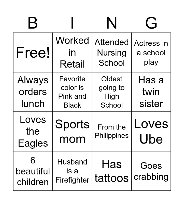 This bingo card has 16 words: 6 beautiful children, Husband is a Firefighter, Attended Nursing School, Actress in a school play, Always orders lunch, Worked in Retail, From the Philippines, Loves Ube, Free!, Favorite color is Pink and Black, Has tattoos, Has a twin sister, Loves the Eagles, Sports mom, Oldest going to High School and Goes crabbing.