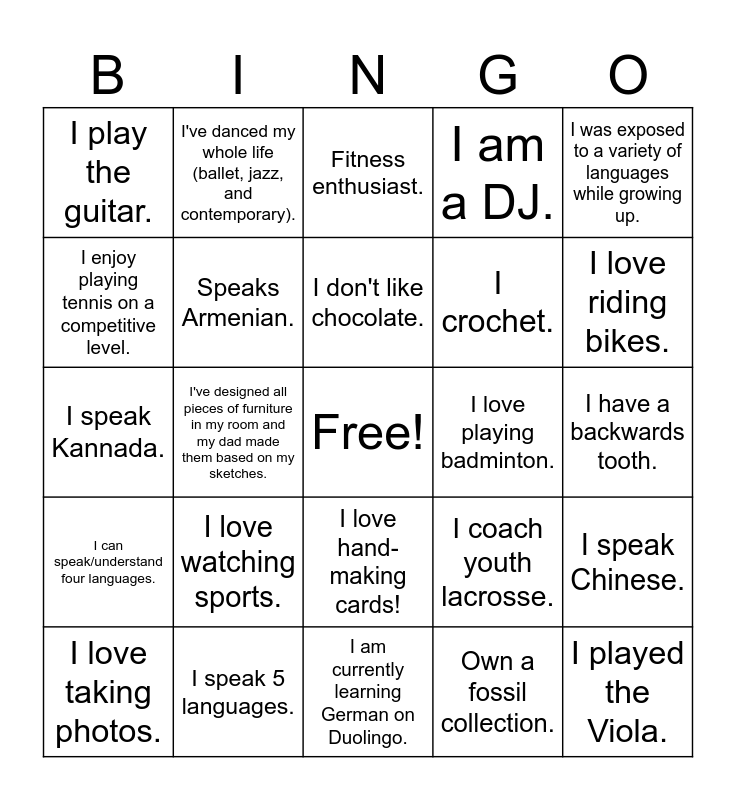 This bingo card has a free space and 26 words: I love hand-making cards!, Own a fossil collection., I don't like chocolate., I speak 5 languages., I was exposed to a variety of languages while growing up., I play the guitar., I enjoy playing tennis on a competitive level., I've danced my whole life (ballet, jazz, and contemporary)., I have a backwards tooth., I coach youth lacrosse., I crochet., I speak Kannada., I speak Chinese., I love taking photos., I've designed all pieces of furniture in my room and my dad made them based on my sketches., Dance salsa., I am a DJ., I can speak/understand four languages., Fitness enthusiast., I played the Viola., I love riding bikes., I am currently learning German on Duolingo., I love playing badminton., I love watching sports., Speaks Armenian. and I sew and create fun fashion pieces..