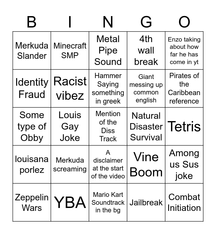 This bingo card has a free space and 24 words: Merkuda screaming, YBA, Hammer Saying something in greek, Zeppelin Wars, Enzo taking about how far he has come in yt, Merkuda Slander, Identity Fraud, Minecraft SMP, Natural Disaster Survival, A disclaimer at the start of the video, Giant messing up common english, Some type of Obby, Vine Boom, Among us Sus joke, Racist vibez, Jailbreak, Tetris, Metal Pipe Sound, Pirates of the Caribbean reference, Louis Gay Joke, Combat Initiation, louisana porlez, 4th wall break and Mario Kart Soundtrack in the bg.