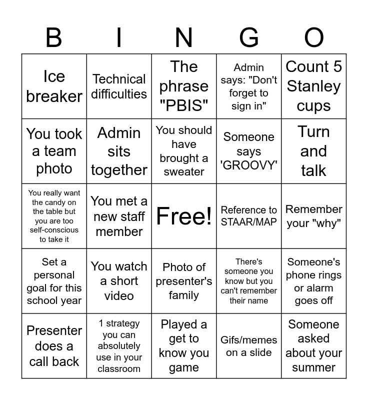 This bingo card has a free space and 24 words: You watch a short video, 1 strategy you can absolutely use in your classroom, You should have brought a sweater, Presenter does a call back, Count 5 Stanley cups, Ice breaker, You took a team photo, Technical difficulties, Reference to STAAR/MAP, Photo of presenter's family, Someone says 'GROOVY', You really want the candy on the table but you are too self-conscious to take it, There's someone you know but you can't remember their name, Someone's phone rings or alarm goes off, Admin sits together, Gifs/memes on a slide, Remember your "why", The phrase "PBIS", Turn and talk, You met a new staff member, Someone asked about your summer, Set a personal goal for this school year, Admin says: "Don't forget to sign in" and Played a get to know you game.