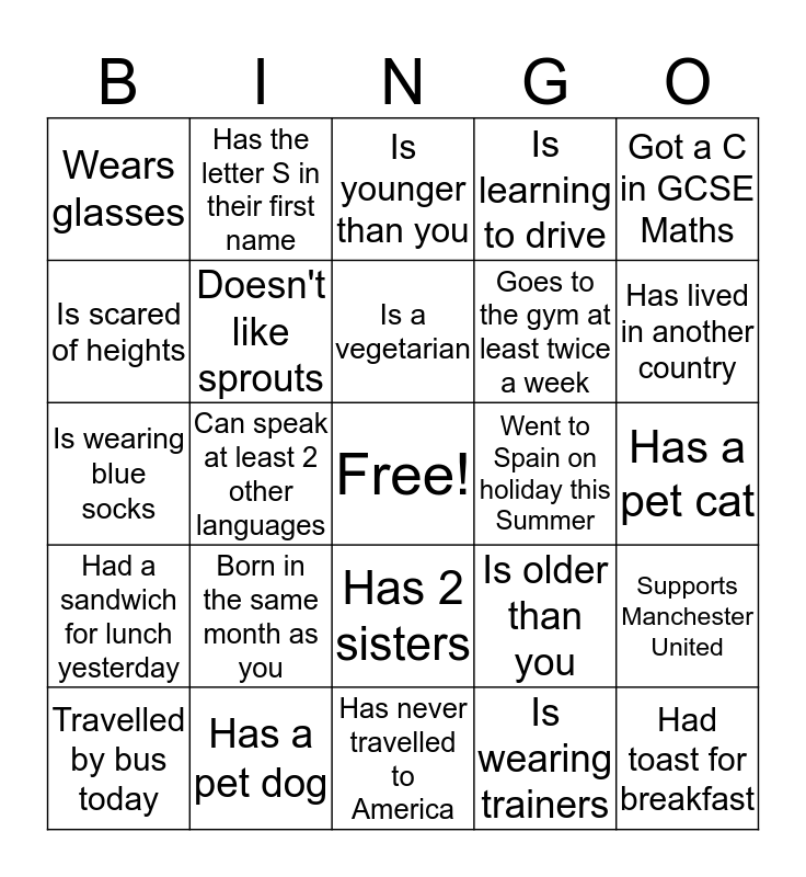 This bingo card has a free space and 24 words: Born in the same month as you, Has a pet dog, Is a vegetarian, Travelled by bus today, Got a C in GCSE Maths, Wears glasses, Is scared of heights, Has the letter S in their first name, Went to Spain on holiday this Summer, Has 2 sisters, Goes to the gym at least twice a week, Is wearing blue socks, Is older than you, Supports Manchester United, Doesn't like sprouts, Is wearing trainers, Has a pet cat, Is younger than you, Has lived in another country, Can speak at least 2 other languages, Had toast for breakfast, Had a sandwich for lunch yesterday, Is learning to drive and Has never travelled to America.