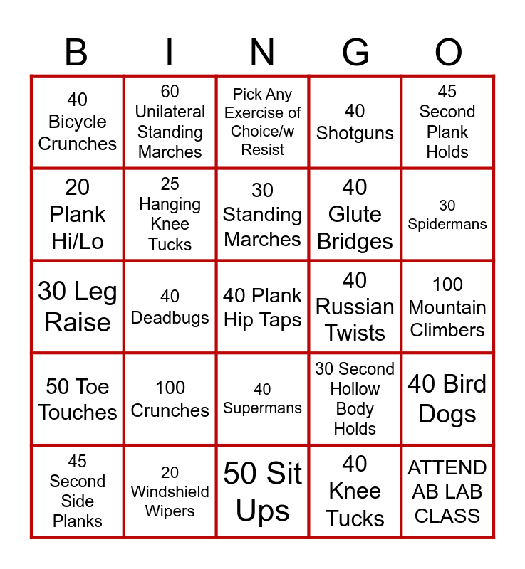 This bingo card has 25 words: 100 Crunches, 50 Sit Ups, 30 Standing Marches, 45 Second Side Planks, 45 Second Plank Holds, 40 Bicycle Crunches, 20 Plank Hi/Lo, 60 Unilateral Standing Marches, 40 Russian Twists, 40 Supermans, 40 Glute Bridges, 30 Leg Raise, 30 Second Hollow Body Holds, 40 Bird Dogs, 25 Hanging Knee Tucks, ATTEND AB LAB CLASS, 100 Mountain Climbers, Pick Any Exercise of Choice/w Resist, 30 Spidermans, 40 Deadbugs, 40 Plank Hip Taps, 20 Windshield Wipers, 50 Toe Touches, 40 Shotguns and 40 Knee Tucks.