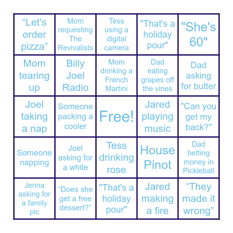 This bingo card has a free space and 24 words: Joel asking for a white, “Does she get a free dessert?”, Mom drinking a French Martini, Jenna asking for a family pic, "She's 60", “Let’s order pizza”, Mom tearing up, Mom requesting The Revivalists, Jared playing music, Tess drinking rose, Dad eating grapes off the vines, Joel taking a nap, House Pinot, Dad betting money in Pickleball, Billy Joel Radio, Jared making a fire, "Can you get my back?", Tess using a digital camera, Dad asking for butter, Someone packing a cooler, “They made it wrong”, Someone napping, "That's a holiday pour" and "That's a holiday pour".