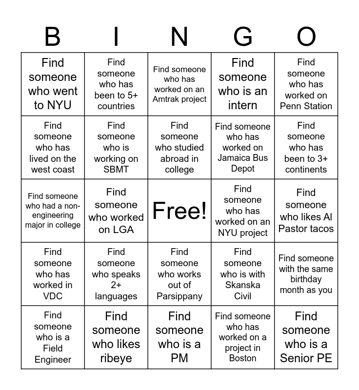 This bingo card has a free space and 46 words: Find someone who is a PE, Find someone who is a Senior PE, Find someone who is an APM, Find someone who is a PM, Find someone who speaks 2+ languages, Find someone who has 2+ siblings, Find someone who has been to 5+ countries, Find someone who is a native New Yorker, Find someone who has lived on the west coast, Find someone who has been with Skanska for 5+ years, Find someone who is working on SBMT, Find someone who is an intern, Find someone with the same birthday month as you, Find someone who is with Skanska Civil, Find someone who is with USB, Find someone who can play an instrument, Find someone who studied abroad in college, Find someone who has worked on an NYU project, Find someone who has worked on an EDC project, Find someone who has worked on Penn Station, Find someone who worked on LGA, Find someone who has worked on a project in Boston, Find someone who went to NYU, Find someone who has worked on Jamaica Bus Depot, Find someone who has worked on Cold Spring Harbor, Find someone who has been to 3+ continents, Find someone who is a Field Engineer, Find someone who works out of Bulova, Find someone who works out of Parsippany, Find someone who has worked in VDC, Find someone who likes Bahn Mi, Find someone who likes Chicken Tikka Masala, Find someone who likes sushi, Find someone who orange chicken, Find someone who likes raw tuna, Find someone who likes ribeye, Find someone who likes Al Pastor tacos, Find someone who likes Chili Dogs, Find someone who has a tattoo, Find someone who has worked on Penn Station, Find someone who has worked on Portal North, Find someone who has worked on an Amtrak project, Find someone who had a non-engineering major in college, Find someone who has gone camping, Find someone who has run a marathon and Find someone who has been to 3+ continents.