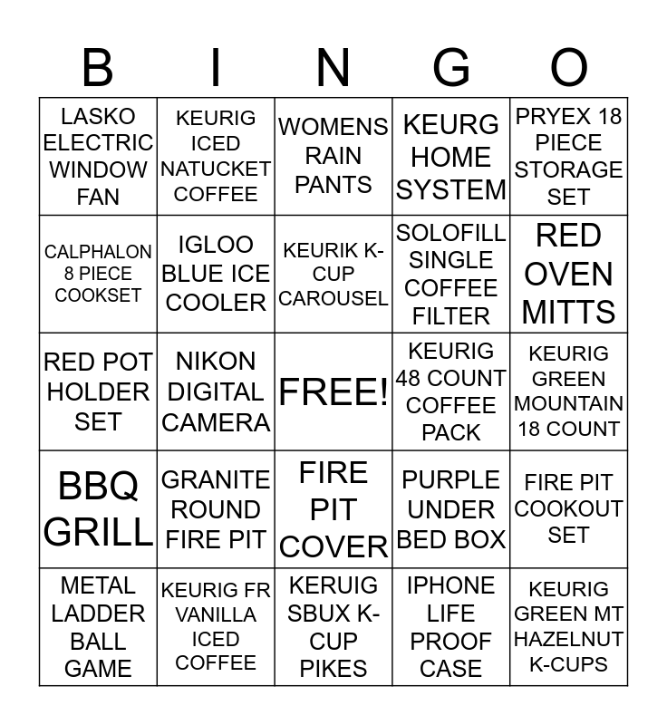 This bingo card has a free space and 24 words: GRANITE ROUND FIRE PIT, KEURIG FR VANILLA ICED COFFEE, KEURIK K-CUP CAROUSEL, METAL LADDER BALL GAME, PRYEX 18 PIECE STORAGE SET, LASKO ELECTRIC WINDOW FAN, CALPHALON 8 PIECE COOKSET, KEURIG ICED NATUCKET COFFEE, KEURIG 48 COUNT COFFEE PACK, FIRE PIT COVER, SOLOFILL SINGLE COFFEE FILTER, RED POT HOLDER SET, PURPLE UNDER BED BOX, FIRE PIT COOKOUT SET, IGLOO BLUE ICE COOLER, IPHONE LIFE PROOF CASE, KEURIG GREEN MOUNTAIN 18 COUNT, WOMENS RAIN PANTS, RED OVEN MITTS, NIKON DIGITAL CAMERA, KEURIG GREEN MT HAZELNUT K-CUPS, BBQ GRILL, KEURG HOME SYSTEM and KERUIG SBUX K-CUP PIKES.