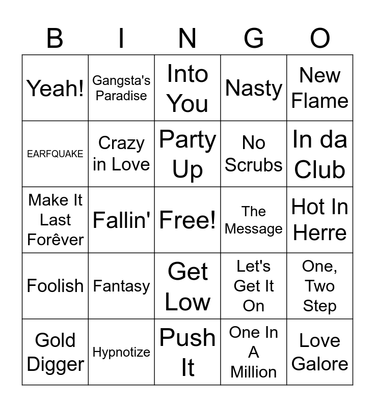 This bingo card has a free space and 32 words: One In A Million, Let's Stay Together, Fallin', Respect, Foolish, Crazy in Love, New Flame, One, Two Step, Gangsta's Paradise, Say My Name, Party Up, Into You, Killing Me Softly With His Song, Pony, The Message, No Role Modelz, Gold Digger, Make It Last Forêver, Get Low, Fantasy, Let's Get It On, Family Affair, Hot In Herre, Hypnotize, Love Galore, Nasty, No Scrubs, EARFQUAKE, Yeah!, Push It, California Love and In da Club.