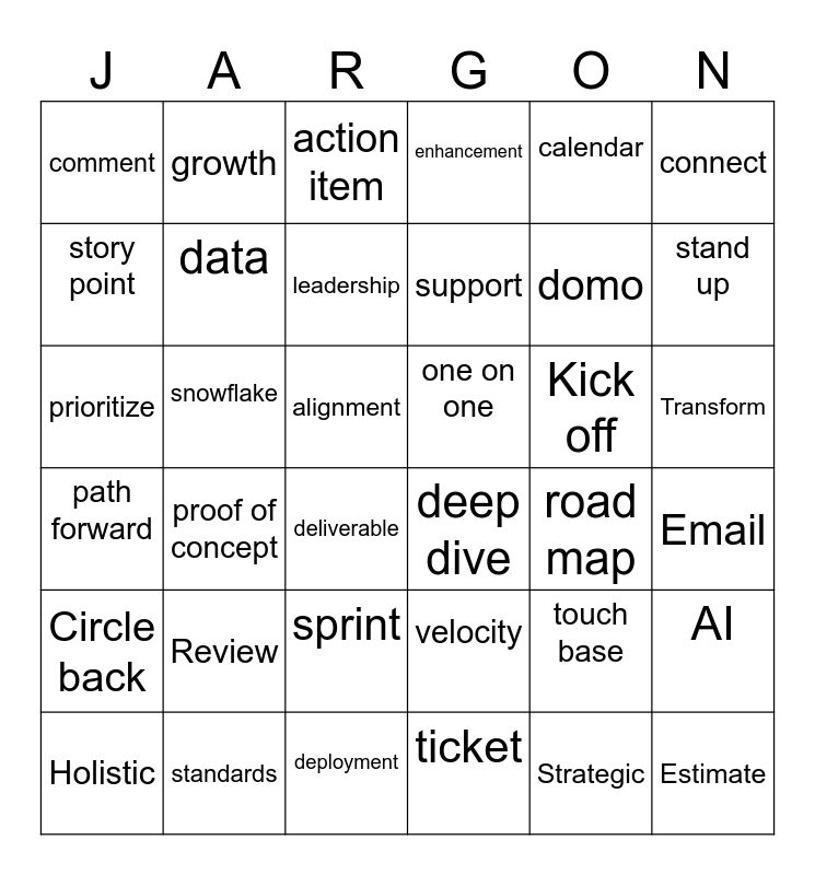 This bingo card has 36 words: velocity, sprint, ticket, story point, path forward, one on one, data, deployment, calendar, touch base, stand up, enhancement, AI, snowflake, support, comment, Circle back, Kick off, prioritize, action item, alignment, proof of concept, deep dive, deliverable, road map, growth, domo, standards, leadership, connect, Estimate, Holistic, Email, Transform, Review and Strategic.