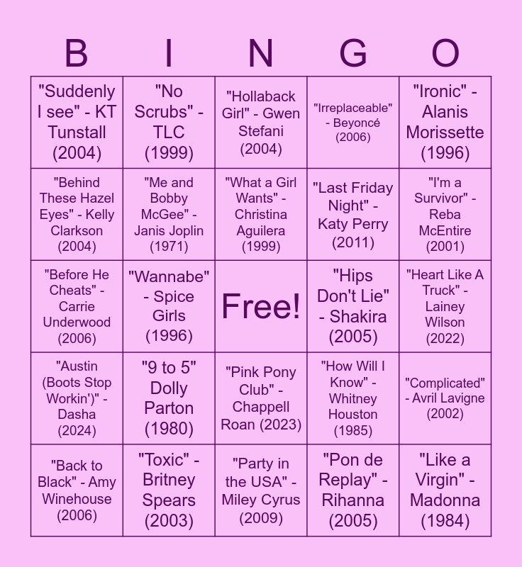 This bingo card has a free space and 49 words: "Rolling in the Deep" - Adele (2011), "Like a Virgin" - Madonna (1984), "Crazy on You" - Heart (1975), "Party in the USA" - Miley Cyrus (2009), "9 to 5" Dolly Parton (1980), "Man! I Feel Like A Woman" - Shania Twain (1997), "No Scrubs" - TLC (1999), "Girl On Fire" - Alicia Keys (2012), "Behind These Hazel Eyes" - Kelly Clarkson (2004), Stop! In the Name of Love" - The Supremes (1965), "Me and Bobby McGee" - Janis Joplin (1971), "Irreplaceable" - Beyoncé (2006), "Complicated" - Avril Lavigne (2002), "How Will I Know" - Whitney Houston (1985), "Endless Love" - Diana Ross (1981), "Raise Your Glass" - P!nk (2010), "What a Girl Wants" - Christina Aguilera (1999), "Hips Don't Lie" - Shakira (2005), "Girls Just Want to Have Fun" - Cyndi Lauper (1983), "Ironic" - Alanis Morissette (1996), "Wannabe" - Spice Girls (1996), "Pon de Replay" - Rihanna (2005), "Suddenly I see" - KT Tunstall (2004), "Last Friday Night" - Katy Perry (2011), "Love Story" - Taylor Swift (2008), "I'm a Survivor" - Reba McEntire (2001), "Back to Black" - Amy Winehouse (2006), "Please Please Please" - Sabrina Carpenter (2024), "Pink Pony Club" - Chappell Roan (2023), "Austin (Boots Stop Workin')" - Dasha (2024), "Big Girls Don't Cry" - Fergie (2006), "Bubbly" - Colbie Caillat (2007), "Super Bass" - Nicki Minaj (2010), "Edge of Seventeen" - Stevie Nicks (1981), "Toxic" - Britney Spears (2003), "What's Love Got to Do with It" - Tina Turner (1984), "Believe" - Cher (1998), "Shoop" - Salt N Pepa (1993), "Heart Like A Truck" - Lainey Wilson (2022), "good 4 u" - Olivia Rodrigo (2021), "Total Eclipse of the Heart" - Bonnie Tyler (1983), "TiK ToK" - Ke$ha (2010), "We Belong Together" - Mariah Carey (2005), "At Last" - Etta James (1960), "Before He Cheats" - Carrie Underwood (2006), "Hollaback Girl" - Gwen Stefani (2004), "Poker Face" - Lady Gaga (2008), "Cheap Thrills" - Sia (2016) and "Heart of Glass" - Blondie (1978).