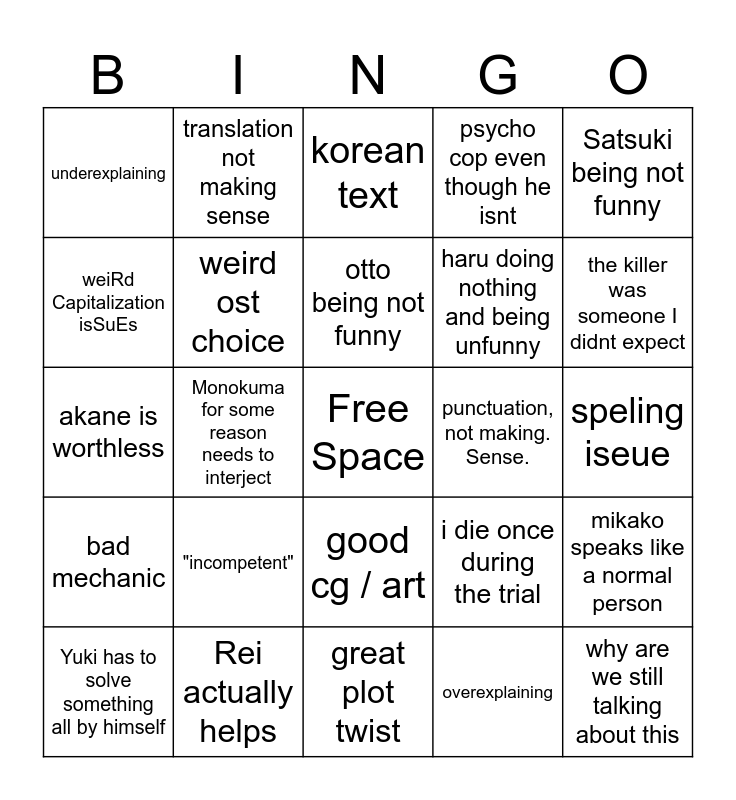This bingo card has a free space and 24 words: Yuki has to solve something all by himself, "incompetent", otto being not funny, overexplaining, Satsuki being not funny, underexplaining, translation not making sense, korean text, punctuation, not making. Sense., speling iseue, akane is worthless, weird ost choice, i die once during the trial, mikako speaks like a normal person, weiRd Capitalization isSuEs, Rei actually helps, great plot twist, psycho cop even though he isnt, the killer was someone I didnt expect, bad mechanic, Monokuma for some reason needs to interject, good cg / art, haru doing nothing and being unfunny and why are we still talking about this.