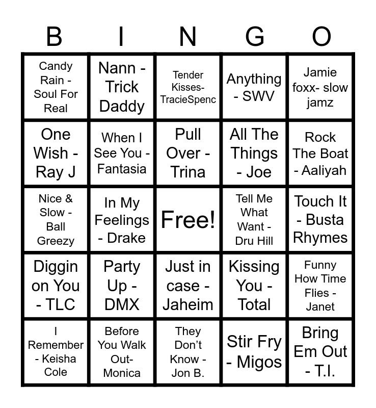 This bingo card has a free space and 27 words: Kissing You - Total, I Wish - Carl Thomas, All The Things - Joe, They Don’t Know - Jon B., One Wish - Ray J, Tender Kisses-TracieSpenc, Nann - Trick Daddy, Diggin on You - TLC, Tell Me What Want - Dru Hill, Funny How Time Flies - Janet, Nice & Slow - Ball Greezy, Anything - SWV, I Remember - Keisha Cole, Before You Walk Out- Monica, Rock The Boat - Aaliyah, I’m a Thug - Trick Daddy, When I See You - Fantasia, Pull Over - Trina, Party Up - DMX, Candy Rain - Soul For Real, Touch It - Busta Rhymes, Stir Fry - Migos, In My Feelings - Drake, Bring Em Out - T.I., Just in case - Jaheim, Jamie foxx- slow jamz and Jamie foxx - unpredictable.