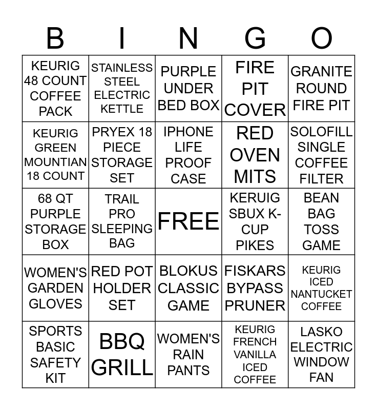 This bingo card has a free space and 24 words: RED POT HOLDER SET, BBQ GRILL, IPHONE LIFE PROOF CASE, SPORTS BASIC SAFETY KIT, GRANITE ROUND FIRE PIT, KEURIG 48 COUNT COFFEE PACK, KEURIG GREEN MOUNTIAN 18 COUNT, STAINLESS STEEL ELECTRIC KETTLE, KERUIG SBUX K-CUP PIKES, BLOKUS CLASSIC GAME, RED OVEN MITS, 68 QT PURPLE STORAGE BOX, FISKARS BYPASS PRUNER, KEURIG ICED NANTUCKET COFFEE, PRYEX 18 PIECE STORAGE SET, KEURIG FRENCH VANILLA ICED COFFEE, BEAN BAG TOSS GAME, PURPLE UNDER BED BOX, SOLOFILL SINGLE COFFEE FILTER, TRAIL PRO SLEEPING BAG, LASKO ELECTRIC WINDOW FAN, WOMEN'S GARDEN GLOVES, FIRE PIT COVER and WOMEN'S RAIN PANTS.