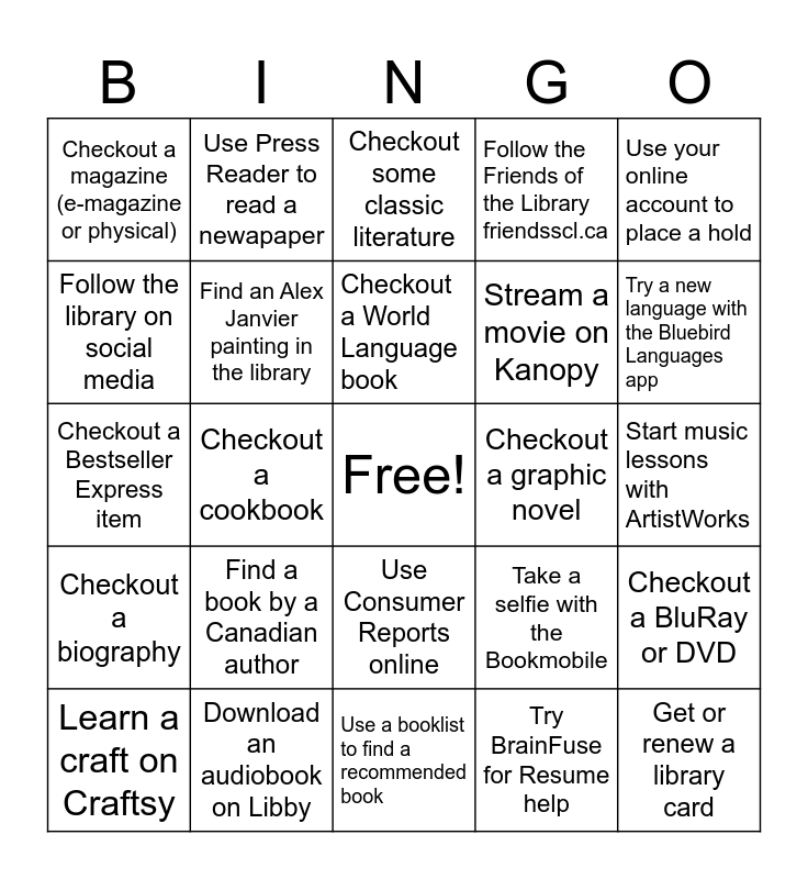 This bingo card has a free space and 24 words: Find a book by a Canadian author, Download an audiobook on Libby, Checkout a World Language book, Learn a craft on Craftsy, Use your online account to place a hold, Checkout a magazine (e-magazine or physical), Follow the library on social media, Use Press Reader to read a newapaper, Checkout a graphic novel, Use Consumer Reports online, Stream a movie on Kanopy, Checkout a Bestseller Express item, Take a selfie with the Bookmobile, Checkout a BluRay or DVD, Find an Alex Janvier painting in the library, Try BrainFuse for Resume help, Start music lessons with ArtistWorks, Checkout some classic literature, Try a new language with the Bluebird Languages app, Checkout a cookbook, Get or renew a library card, Checkout a biography, Follow the Friends of the Library friendsscl.ca and Use a booklist to find a recommended book.