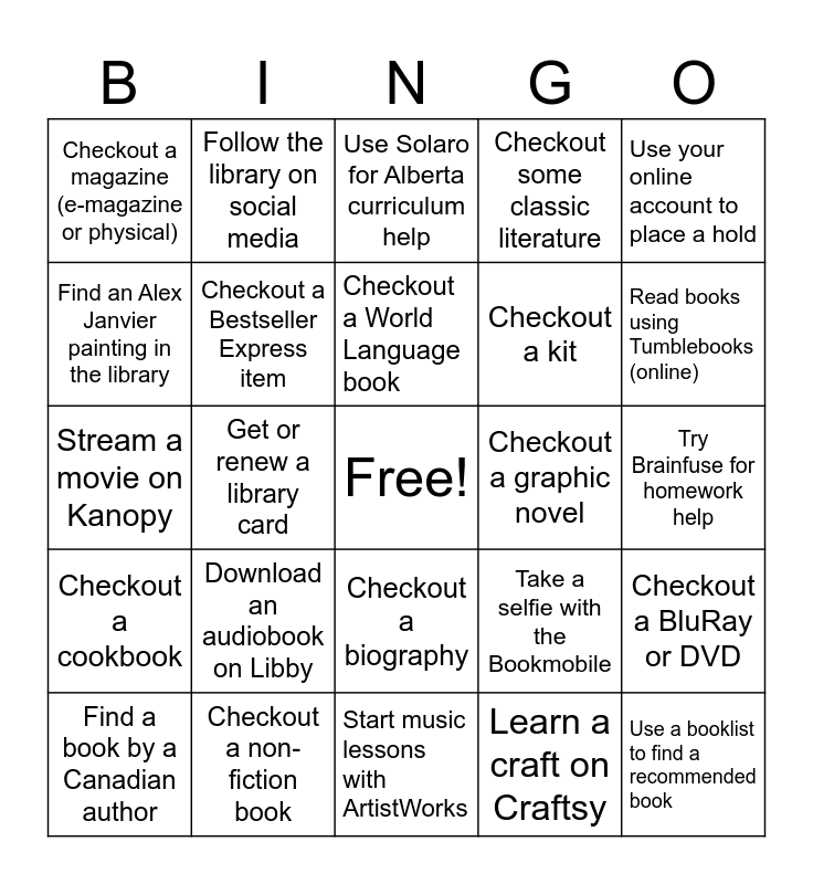 This bingo card has a free space and 24 words: Find a book by a Canadian author, Download an audiobook on Libby, Checkout a World Language book, Learn a craft on Craftsy, Use your online account to place a hold, Checkout a magazine (e-magazine or physical), Follow the library on social media, Use Solaro for Alberta curriculum help, Checkout a graphic novel, Try Brainfuse for homework help, Stream a movie on Kanopy, Checkout a Bestseller Express item, Take a selfie with the Bookmobile, Checkout a BluRay or DVD, Find an Alex Janvier painting in the library, Checkout a non-fiction book, Start music lessons with ArtistWorks, Checkout some classic literature, Read books using Tumblebooks (online), Checkout a cookbook, Get or renew a library card, Checkout a biography, Checkout a kit and Use a booklist to find a recommended book.