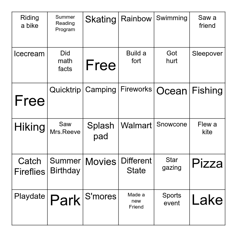 This bingo card has 36 words: Different State, Movies, Made a new Friend, Icecream, Hiking, Fireworks, Did math facts, S'mores, Swimming, Star gazing, Sleepover, Rainbow, Pizza, Quicktrip, Build a fort, Riding a bike, Catch Fireflies, Ocean, Free, Skating, Camping, Saw Mrs.Reeve, Walmart, Splash pad, Snowcone, Summer Reading Program, Got hurt, Park, Free, Saw a friend, Lake, Playdate, Flew a kite, Fishing, Summer Birthday and Sports event.
