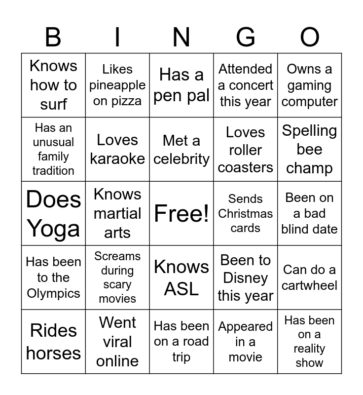 This bingo card has a free space and 26 words: Knows ASL, Appeared in a movie, Met a celebrity, Went viral online, Owns a gaming computer, Knows how to surf, Has an unusual family tradition, Likes pineapple on pizza, Been on a bad blind date, Been to Disney this year, Loves roller coasters, Does Yoga, Can do a cartwheel, Rides horses, Knows martial arts, Started a club, Attended a concert this year, Has been to the Olympics, Has a pen pal, Has been on a reality show, Spelling bee champ, Has been on a road trip, Sends Christmas cards, Screams during scary movies, Loves karaoke and Was lead in a play.