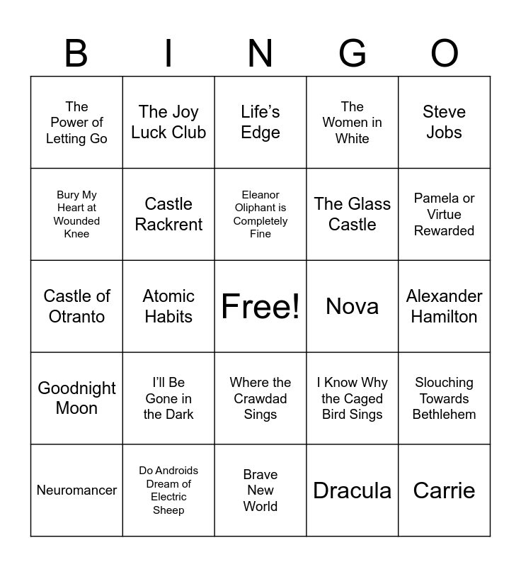 This bingo card has a free space and 68 words: The Notebook, Carrie, The Haunting of Hill House, All the Light We Cannot See, The Fault in Our Stars, Harry Potter, The Joy Luck Club, The Help, Eleanor Oliphant is Completely Fine, A Man Called Ove, Where the Crawdad Sings, To Kill a Mockingbird, Alexander Hamilton, Steve Jobs, The Devil in the White City, Bury My Heart at Wounded Knee, Atomic Habits, The Power of Letting Go, In Cold Blood, I’ll Be Gone in the Dark, The Glass Castle, I Know Why the Caged Bird Sings, Goodnight Moon, Charlotte’s Web, The Boy, The Mole, The Fox, and the Horse, The World of Edena, Legoland, A Room of One’s Own, Slouching Towards Bethlehem, The Premonition, Life’s Edge, Pride and Prejudice, Frankenstein, Gulliver’s Travels, The Women in White, Little Women, The Lord of the Rings, Neuromancer, Pamela or Virtue Rewarded, Castle of Otranto, The Spy, Phantastes, Castle Rackrent, The Virginian, Wilhelm Meister’s Apprenticeship, We, A Universal History of Infamy, The Well at the World’s End, Nova, Do Androids Dream of Electric Sheep, Chronicles of Narnia, The Great Gatsby, 1984, Brave New World, Wuthering Heights, Jane Eyre, Dracula, One Hundred Years of Solitude, The House of Spirits, Midnight’s Children, Kafka on the Shore, Ocean at the End of the Lane, Snow Crash, Altered Carbon, Game of Thrones, The Way of Kings, Dune and The Left Hand of Darkness.